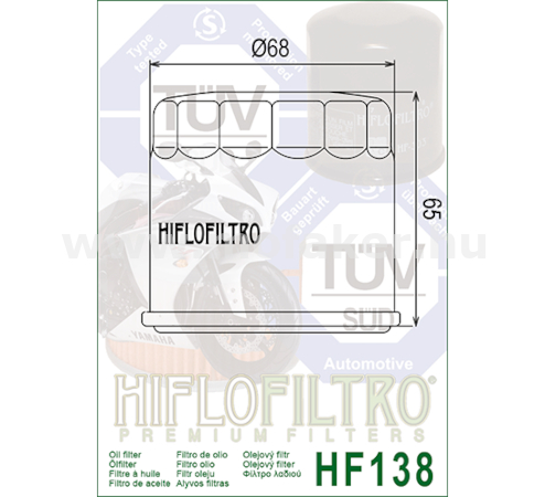 225738  Olajszűrő HF 138 HifloFiltro (SUZUKI Burgman, Bandit, GSX-R) 68x65mm