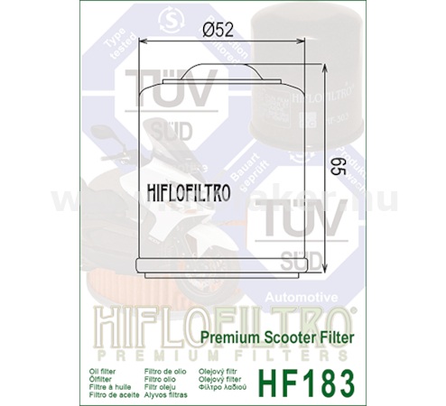 A HifloFiltro HF183 a világ elsö és egyetlen TÜV jóváhagyással rendelkezö motorkerékpár olajszurö családjának tagja. Ezt a prémium szuröt kifejezetten az olasz és európai robogók széles skálájához (Piaggio, Aprilia, Vespa, Gilera, Derbi) fejlesztették ki. Müszaki adatok (Hivatalos): Típus: Felcsavarható (Spin-on) fémházas olajszurö Felhasználás: Prémium Scooter szurö Föbb kompatibilis modellek (kivonat): PIAGGIO / VESPA: Liberty 125/150/200, Beverly 125/200/250/300, Medley 125/150, MP3 125/250/300, Vespa ET4, Vespa GT/GTS/GTV 125/200/250/300, Vespa LX/LXV/S 125/150, Vespa Primavera/Sprint 125/150, X7, X8, X9, X10, Zip 125. APRILIA: Atlantic 125/200/250/300, Mojito 125/150, Scarabeo 125/200/250/300, Sport City 125/200/250/300, SR Max 125/300, SR Motard 125. GILERA: DNA 125/180, Nexus 125/250/300, Runner VX/VXR 125/180/200. DERBI: Boulevard 125/150/200/250, GP1 125/250, Rambla 125/250/300. PEUGEOT: Geopolis 250/300, Satelis 250/300. MALAGUTI: Madison 125/180/200/250, Phantom Max 200/250. Helyettesíthetö gyári (OEM) cikkszámok: Piaggio: 483727, 82635R Italjet: 210483727 Malaguti: 46400200 Peugeot: 756162 Megjegyzés: A HF183 a legelterjedtebb szurö a 125-300 ccm közötti Piaggio-csoportos motorral szerelt robogókhoz. Vásárlás elött kérjük, ellenörizze a pontos típust és évjáratot a gyártói katalógusban!