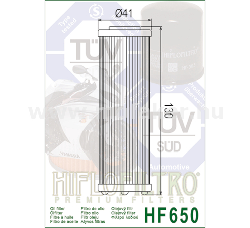 A HifloFiltro HF650 a világ elsö és egyetlen TÜV jóváhagyással rendelkezö motorkerékpár olajszurö családjának tagja. A gyártás során felhasznált prémium alapanyagok garantálják az OEM (gyári) minöséggel megegyezö vagy annál jobb szurési hatékonyságot és a motor maximális védelmét. Müszaki adatok (Hivatalos): Típus: Papír alapú belsö olajszurö Magasság: 130 mm Átmérö: 41 mm Föbb kompatibilis modellek (kivonat): KTM MOTOR: 790 Adventure / Duke (18-25), 890 Adventure / Duke / SMT (20-25), 950 Adventure / Supermoto (03-08), 990 Adventure / Super Duke / SM-T / SM-R (05-13), 1050 Adventure, 1090 Adventure, 1190 Adventure / RC8 / RC8 R (08-16), 1290 Super Adventure / Super Duke R/GT (14-25), 1390 Super Duke R / EVO (24-26). KTM ATV: 450 SX, 505 SX (09-12). HUSQVARNA: Norden 901 (22-26), 701/801 Svartpilen / Vitpilen (24-26), FR450 Rally. GAS GAS: RX450 F (24-26). Helyettesíthetö gyári (OEM) cikkszámok: KTM: 600.38.015.000, 600.38.015.100 KTM: 613.38.015.000, 613.38.015.100, 613.38.015.201 KTM: 835.38.005.000, 835.38.005.001 Megjegyzés: A HF650 szurö a nagy köbcentis KTM és Husqvarna modellek (LC8 és LC8c blokkok) alapvetö karbantartási alkatrésze. Vásárlás elött kérjük, minden esetben ellenörizze a pontos típust és évjáratot a gyártói katalógusban!